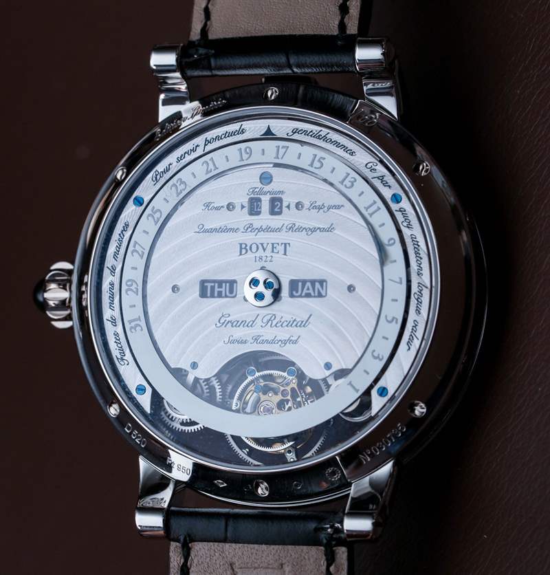 Bovet Récital 22 Grand Récital 以圓形表殼開始,由于其楔形形狀,該表殼厚度不對稱。這不是第一個這樣做的播威 Récital 時計,它確實使欣賞表盤更符合人體工程學。它還有助于手表的整體設計更加與眾不同。其他圓形的表殼尺寸很大,但也非常耐磨,寬 46.3 毫米,厚 19.6 毫米(最寬處)。表殼防水深度為 30m,頂部和底部夾有 AR 涂層藍寶石水晶。雖然表殼有一系列嵌入式按鈕來校正機芯提供的各種功能,但除了表冠外,表殼還有一個位于 12 點鐘位置的大而顯眼的按鈕。按下時,此按鈕會將所有日歷設置提前一天,