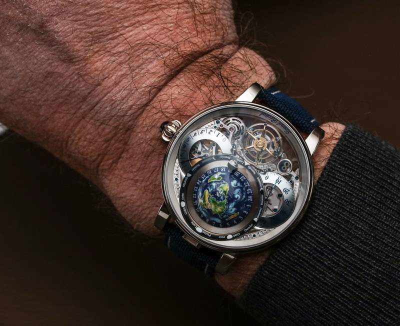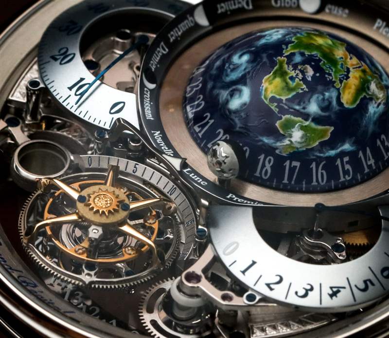 與其他同類時計的情況一樣,手表內部的機械機芯和表盤之間沒??有明顯的區別。兩者都連接在一起,因為刻度、刻度盤和其他指示器直接構建在機芯本身上。除此之外,播威 Récital 22 Grand Récital 還大量使用手工精加工、雕刻和繪畫。半成品的地球儀展示很漂亮,而且是手工精心繪制的。繪畫過程中使用的最好的視覺技巧是夜光琺瑯漆的應用。播威過去曾嘗試過這種類型的發光涂料,并取得了巨大成功。您可以在這篇文章中看到一些圖像,說明在 Récital 22 Grand Récital 的表面已適當地充入足夠的光線后,表盤上會在黑暗中發光。大多數具有這種傳統風格和復雜性的時計都沒有那種類型的“燈光顯示”來與它的主人分享。話雖如此,告訴時間的系統并不完全是發光的。手表僅以 24 小時格式顯示時間,小時是夜光的,但不是逆跳分針。