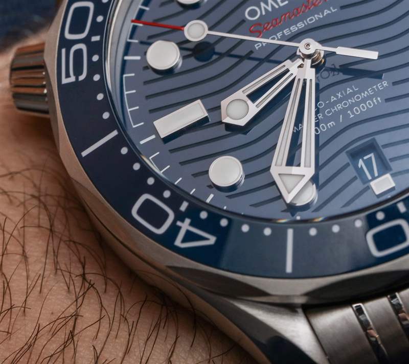 2018 年款 Seamaster 300M 表盤的一項(xiàng)變化是日期窗口的位置,現(xiàn)在位于 6 點(diǎn)鐘位置(相對(duì)于 3 點(diǎn)鐘位置)更加對(duì)稱。歐米茄還告訴我們,存在新規(guī)則,即潛水表需要在所有 12 小時(shí)標(biāo)記處都有發(fā)光點(diǎn)。因此,海馬 300M 在日期窗口下方有一個(gè)小時(shí)標(biāo)。根據(jù)這些新規(guī)則,鑒于大多數(shù)型號(hào)的日期窗口取代了 3 點(diǎn)鐘位置的小時(shí)指示器,Submariner 不會(huì)通過。