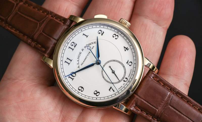 讓我解釋一下跳秒并發癥。位于表冠上方的按鈕用于啟動和停止中央跳秒針的運動。沒有重置或類似的東西。指針沿著正常的順時針路線開始和停止。名稱的跳躍部分指的是中央秒針“滴答”的事實。這通常被稱為“跳動”秒針,但這個詞并不受歡迎,因為營銷人員不喜歡它。他們也經常不喜歡它,因為跳動的秒針也恰好看起來像大多數石英手表上滴答作響的秒針的運動。話雖如此,1815 Homage to Walter Lange 的表盤確實有一個掃秒針——在小表盤上。