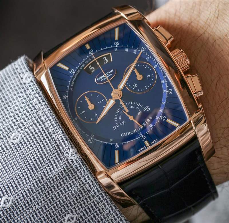 盡管表殼呈酒桶形,但帕瑪強尼將表盤本身設計為圓形,在手表正面的主表盤周圍有一個時標框架和表盤紋理。我們覺得這似乎在角色和功能之間取得了很好的平衡。我們甚至贊揚 Parmigiani 頑固地維護“開放”日期窗口,這是一個難以正確實現的設計元素 – 并且被許多其他尋求將其實施到表盤設計中的品牌正確地放棄了。正確集成后,打開的日期窗口可以彎曲,允許表盤上的設計元素不會過于方形,從而有損于表盤上其他彎曲元素的美學和諧。