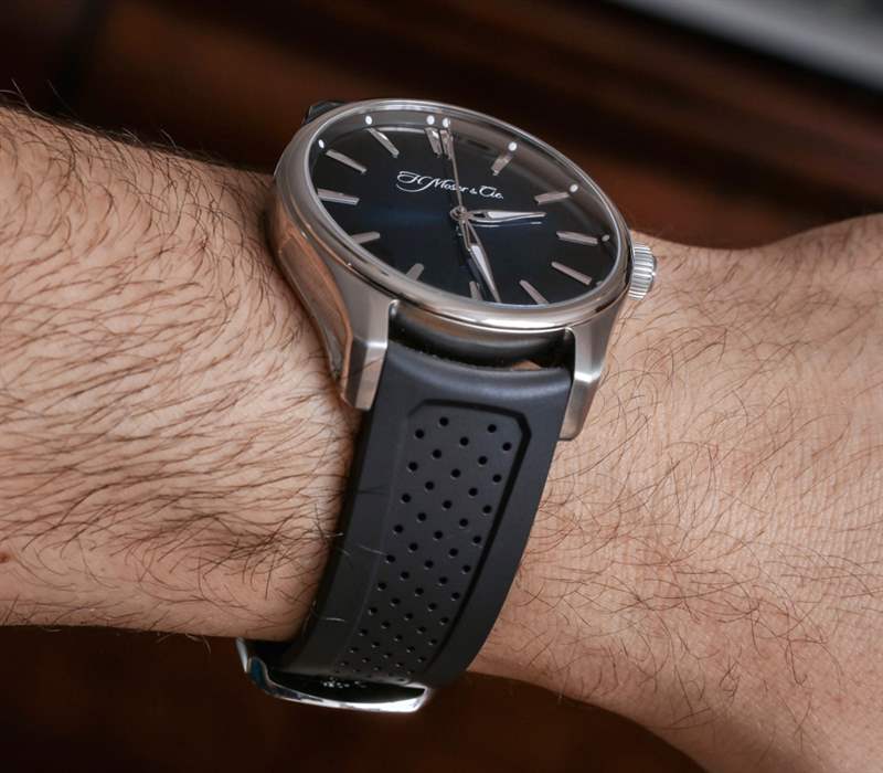 此型號 3200-1200 的表殼尺寸為 42.8 毫米寬,但由于其 15 毫米的厚度(很大程度上是由于水晶)和表耳的重量,手表磨損很大。這是我認(rèn)為任何人都可以佩戴正裝手表的最大值——它看起來最適合在太空游艇上的半正式場合。需要像這樣具有冒險(xiǎn)精神的正裝手表設(shè)計(jì),盡管并非總是對所有觀眾都成功。作為正裝表,有些人可能會認(rèn)為 H. Moser & Cie 將 Pioneer 做得太大了。作為一款運(yùn)動手表(表殼有旋入式表冠,防水深度達(dá) 120m),人們可能會認(rèn)為它有點(diǎn)太無聊和拘束,感覺不到男子氣概。在很多方面,這款 H. Moser & Cie Pioneer Center Seconds 手表讓我想起了Bremont AC I(此處為 aBlogtoWatch 評論).?兩者基本上都是運(yùn)動手表,外觀優(yōu)雅,搭配舒適的(藍(lán)色)橡膠表帶。廣告訊息廣告信息結(jié)束
