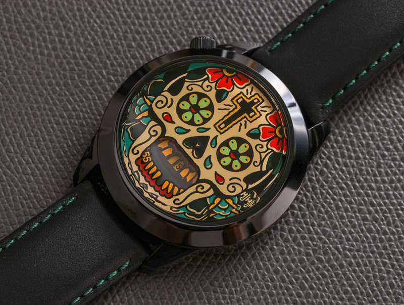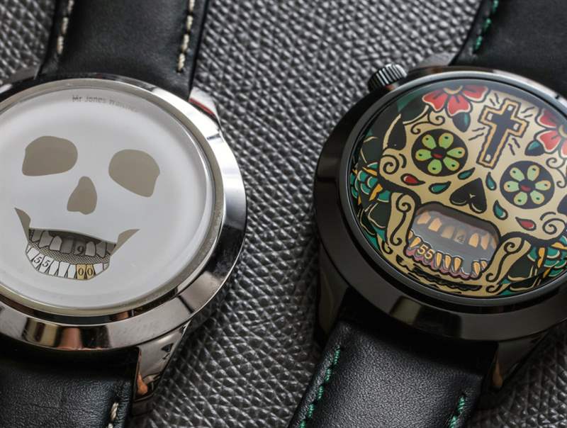 有趣的是 The Last Laugh 和 Last Laugh Tattoo 的比例如何運作良好,這些表盤的尺寸略有增加。兩款手表中比較前衛的是Mr. Jones Watches Last Laugh Tattoo XL。這使用了受墨西哥亡靈節藝術美學啟發的“彩繪”頭骨。這款腕表采用黑色精鋼表殼,搭配黑色皮革表帶,搭配對比色綠松石色縫線,與表盤的部分色調相得益彰。