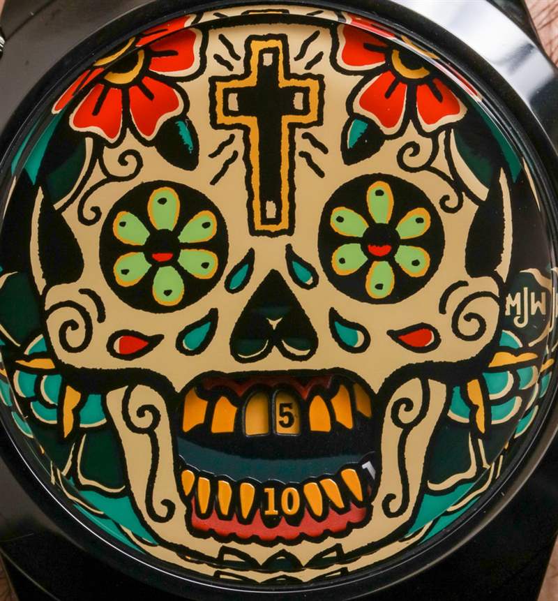 我記得在 2017 年早些時候,他在倫敦的品牌歡迎小店與 Jones Watches 先生的創始人 Crispin Jones 會面。我向他提到的一件事是制造更大版本的手表可能具有的價值。該品牌當時最大的時計為 40 毫米寬——盡管他們的大多數流行款式仍然只采用該品牌的 37 毫米寬表殼。現在接近 2017 年底,Mr. Jones Watches 似乎接受了建議,45 毫米寬的 MJW The Last Laugh XL 和 Last Laugh Tattoo XL 就在這里。在手腕上,我覺得我之前的建議得到了驗證,因為我認為這些 XL 手表以更大、更現代的方式捕捉了手表主題的吸引力,這將為新佩戴者打開品牌。