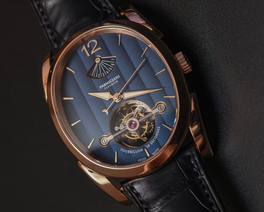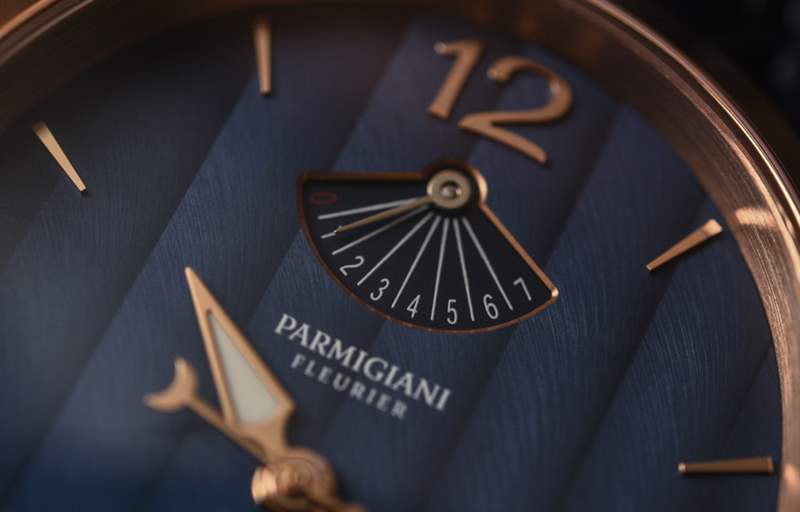 這款 2017 Parmigiani Ovale XL Tourbillon 全新推出了“藍色深淵”色表盤,在金屬底座上涂有藍色,并飾有垂直日內瓦波紋風格的條紋。您不會一直在表盤上看到這些,但它們不再像以前那樣罕見了。時標采用 18k 玫瑰金,與表殼材質和顏色相匹配。