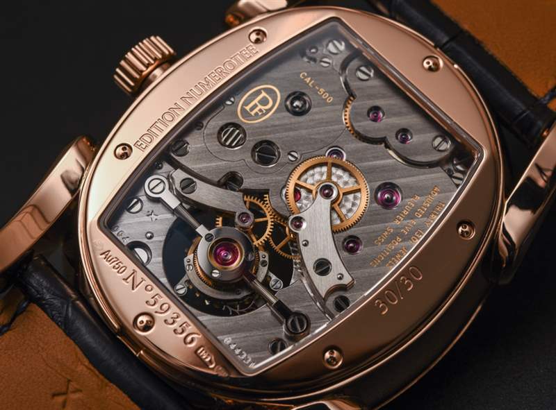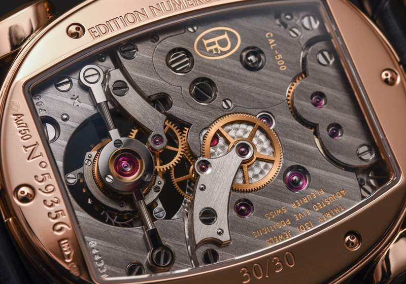 其他為數不多的 30 秒陀飛輪手表(可能是在更罕見的 DeBethune 30 秒陀飛輪腕表型號之外)不太可能擁有持續(xù)一整周的相對穩(wěn)定的動力儲備。兩個發(fā)條盒為手動上鏈機芯提供整整七天的動力儲存。復雜功能包括帶中央秒針的時間、動力儲存指示器,當然還有開放式陀飛輪。PF501機芯由237個零件組成,工作頻率為3Hz。