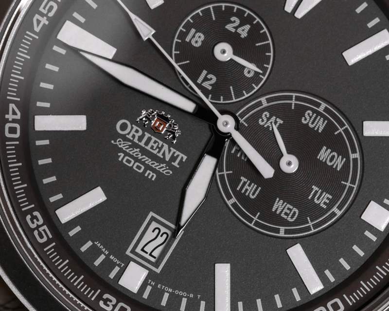 AM/PM 指示器(24 小時小表盤)有兩個用途。首先,如前所述,它是一個方便的 AM/PM 指示器,因為 24 小時時間與主時間同步。其次,它有助于滿足幾乎無處不在的要求,即野外手表具有軍用時間刻度。與大多數將這個刻度放在主小時標記旁邊的野外手表不同,Orient 巧妙地為此使用了子表盤。