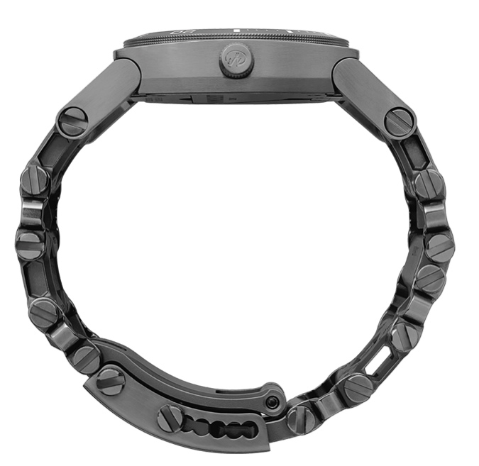 Tread Tempo 有拉絲鋼或黑色涂層鋼可供選擇,其設計令人愉悅、清晰易讀,指針略短。我確實喜歡整體設計,它的靈感主要來自潛水表,并配有旋轉計時表圈。手表內部是瑞士朗達 715 石英機芯。機箱最有趣的部分是背面的可拆卸螺絲刀。這不僅是一款滿足各種需求的一字螺絲刀,也是擰開表鏈的工具。