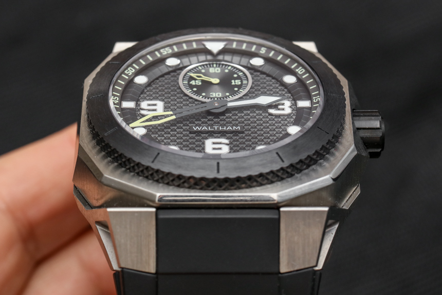 沃爾瑟姆不再是一家美國公司,但這些手表的靈感來自沃爾瑟姆為美國軍方制造的老式軍用時鐘。還有一個不那么微妙的嘗試,讓 Waltham XA 系列具有“德克薩斯大小”的感覺。Waltham 還生產尺寸略小的 AeroNaval AN-01,但 XA(包括已審查的 XA Pure)具有 47 毫米寬的鈦金屬表殼——由于其更堅固的表殼設計,感覺更大。表殼和一體式表耳的鋒利幾何線條看起來既有趣又有趣。5級鈦金屬表殼經過精心加工,表圈周圍是一塊厚厚的黑色陶瓷,頂部經過拉絲處理,側面有滾花紋理。如果 XA 系列缺少任何東西,那肯定不是有趣的案例細節。