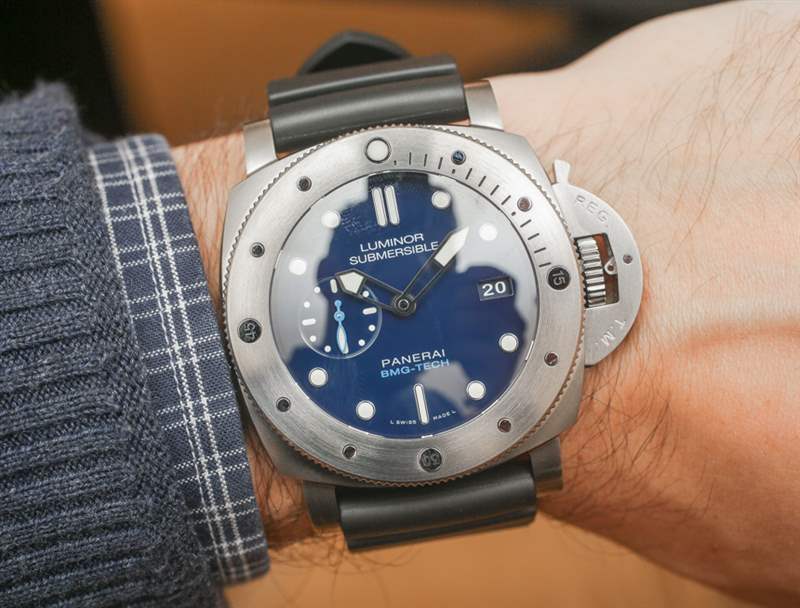 大塊金屬玻璃外殼寬 47 毫米——是的,它穿起來很大(但很舒服)。據我們所知,外殼尺寸與任何其他 Luminor Submersible 1950 型號相同。在 300 米防水表殼內是一個內部制造的沛納海 P.9000 自動機芯,具有三天的動力儲存。在風格上,表盤以藍色為標志,包括深藍色表盤,淺藍色調與鋼色元素混合。