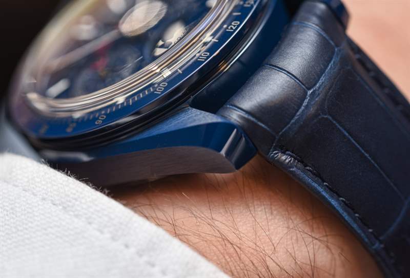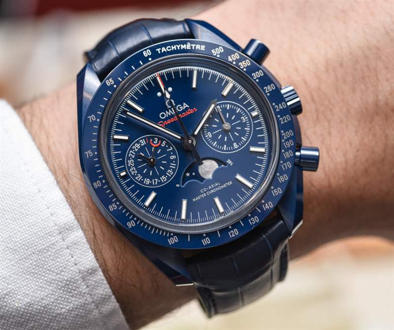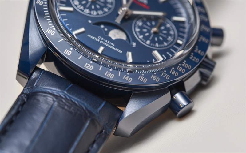 自從最初的 Speedmaster Dark Side Of The Moon(帶有性感的黑色陶瓷表殼)幾年前在 Baselworld 引起轟動以來, “月亮的(顏色)面”已經成為歐米茄的流行語。歐米茄熱切地嘗試通過一系列不同的設計來保持彩色陶瓷表殼的趨勢。甚至 Seamaster Planet Ocean 潛水表也有黑色或藍色陶瓷表殼可供選擇。歐米茄 Speedmaster Blue Side Of The Moon 是 2017 年最新推出的陶瓷超霸腕表——實際上也是唯一一款全新的陶瓷腕表。根據典型的歐米茄慣例,手表的官方(全名)名稱是歐米茄超霸藍色月球同軸主計時計時碼表月相。