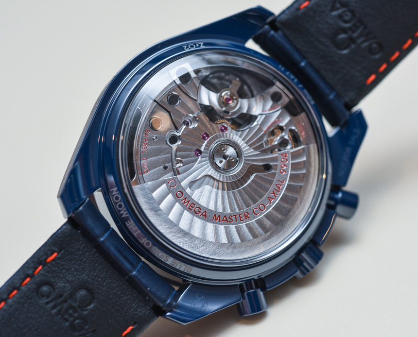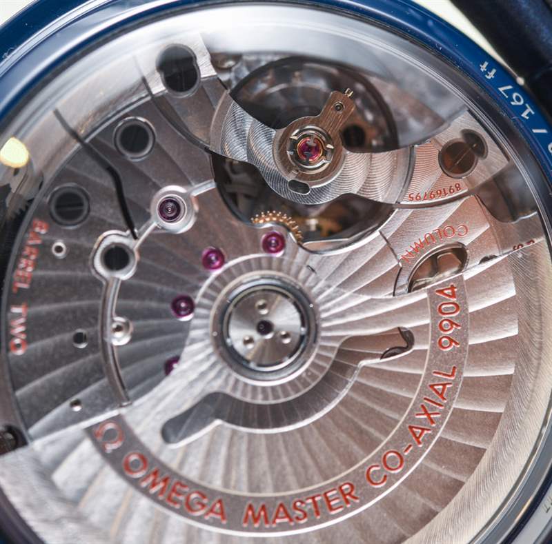 由于我們之前已經介紹過核心的超霸同軸至臻天文臺計時月相腕表,因此我不打算詳細討論機芯或腕表的功能?;叵胍幌?,9904 型機芯在計時碼表和日期復雜功能中增加了月相指示器。機芯表盤布局的對稱性令人印象深刻,令人向往。注意每個子表盤如何有兩只手。這確實是迄今為止最有趣和最吸引人的現代歐米茄機芯之一。當然,它具有同軸擒縱系統、METAS 認證(以及與之相關的一切)、4Hz 工作頻率和 60 小時的動力儲備。通過底蓋的藍寶石水晶窗可以輕松欣賞到機芯。