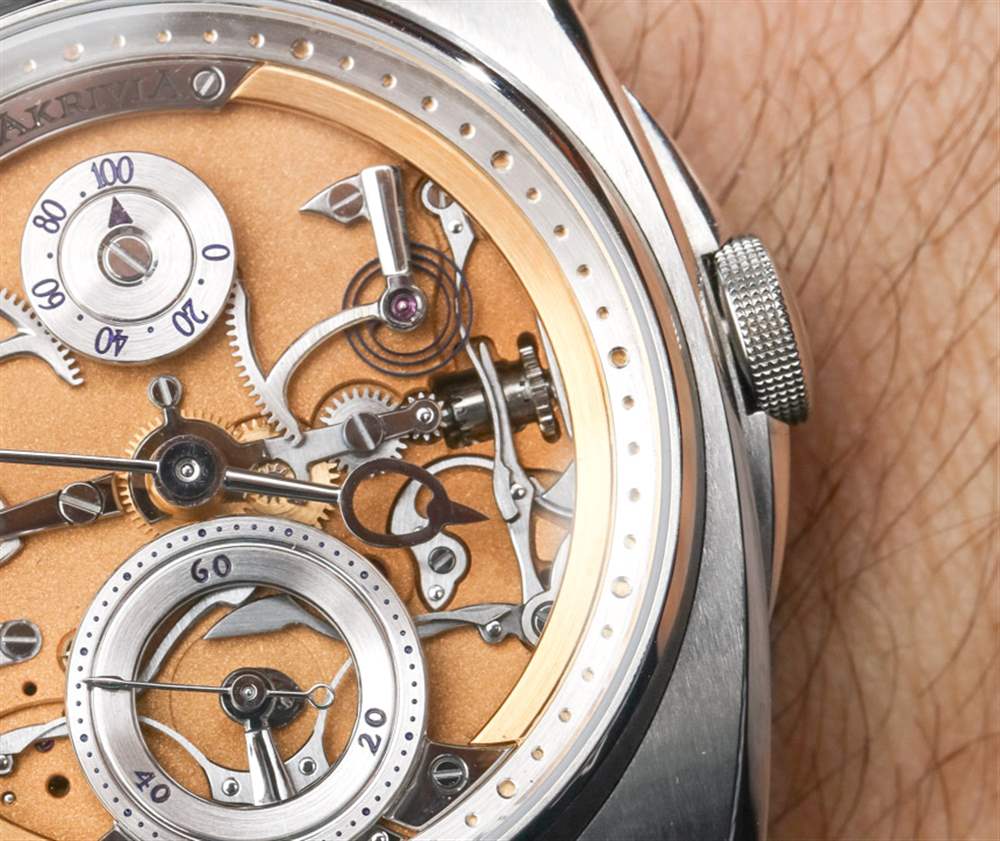 AkriviA AK-06 的背面是手表最傳統的外觀部分,與表盤有很大不同。AkriviA 顯然想在設計中強調對稱性,這在整體上實現得非常好。一座橋貫穿機芯的中心,而調節系統就在它的下方和右側,左側有一個行走裝置,以在視覺上平衡一切。厚重的日內瓦條紋在機芯板上上下延伸,手工處理非常出色。