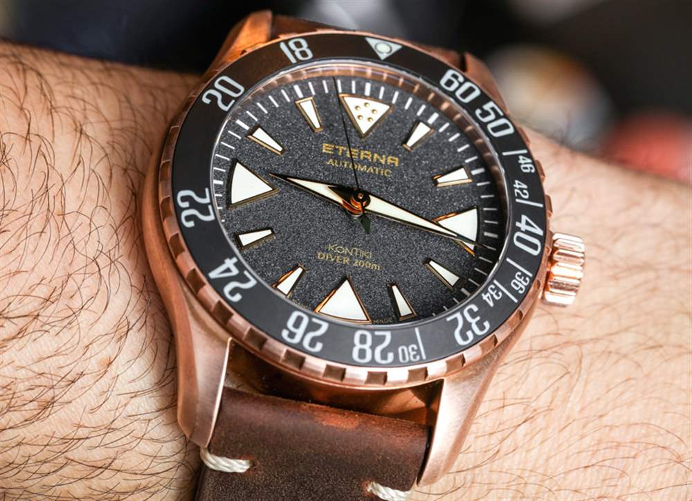 在我愛上潛水表的風格之前,我必須首先愛上它的易讀性和舒適性——這兩者都在 Eterna KonTiki Manufacture Bronze 中獲得了贊譽。這是一款帥氣的、經典主題的潛水表,采用現代皮膚和時尚外觀。即使是表帶也是時尚的,它的棕色皮革款式看起來很老舊(在匹配的青銅扣上)。然而,Eterna 提醒我們,它也經過特殊處理以防水 – 以確保這是一款真正的潛水表。我不確定 Eterna 是否包含額外的表帶,但橡膠表帶(用于更嚴重的水中使用)可能會很好地作為這件作品的配件。