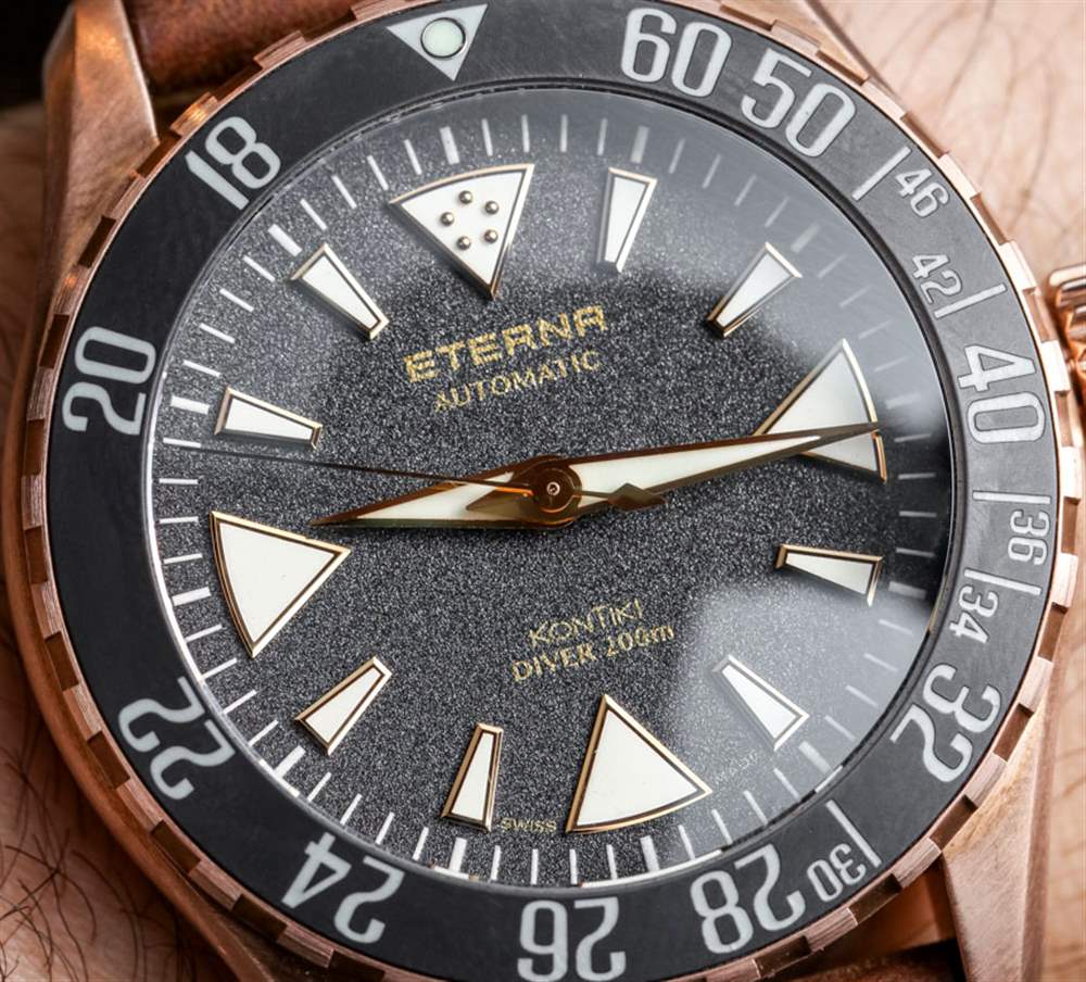 Eterna KonTiki Manufacture Bronze 增加的尺寸似乎與手表的整體大膽主題相吻合。表盤上方是圓頂藍寶石水晶鏡面,可以看到深表盤,加上大型應用時標,可以欣賞到美麗的景色。尤其是面對紋理深灰色的臉(Eterna 稱之為“花崗巖圖案”)。當品牌認為以這種方式使表盤變得有趣時,我真的不能說我有多感激。在像 Eterna KonTiki 這樣的手表上,我們擁有三維、多種材料、多種顏色和各種紋理。所有這些都沒有任何不合適的地方。此外,表盤設計不會讓您想起其他任何東西。