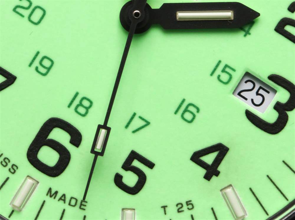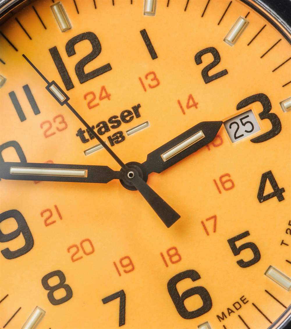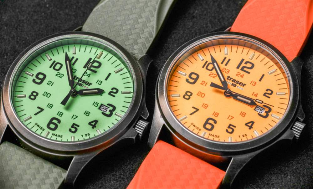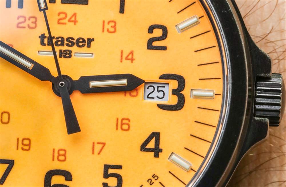 表盤結合了 Taser 對氚氣管的典型使用,以及用于黑暗照明的 Super-LumiNova。三只手各有氣管,還有時標。另請注意 12 點鐘下方徽標中的兩個氣管。Traser 說,這些用于幫助在黑暗中確定表盤的位置,以便您可以更輕松地讀取時間——這是一件好事。表盤的其余部分涂有綠色或橙色 Super-LumiNova。這與黑色指針和阿拉伯小時數字形成鮮明對比。
