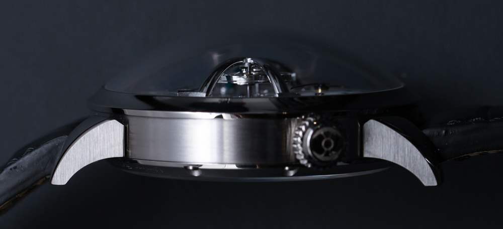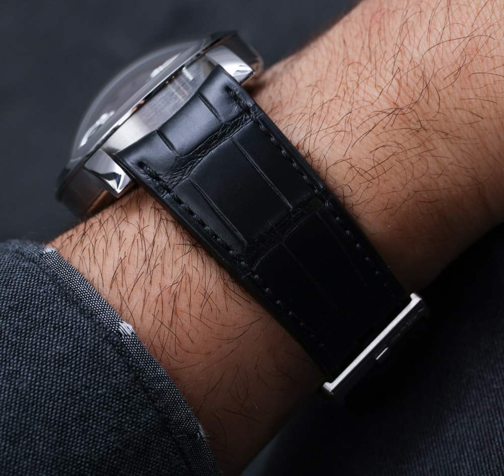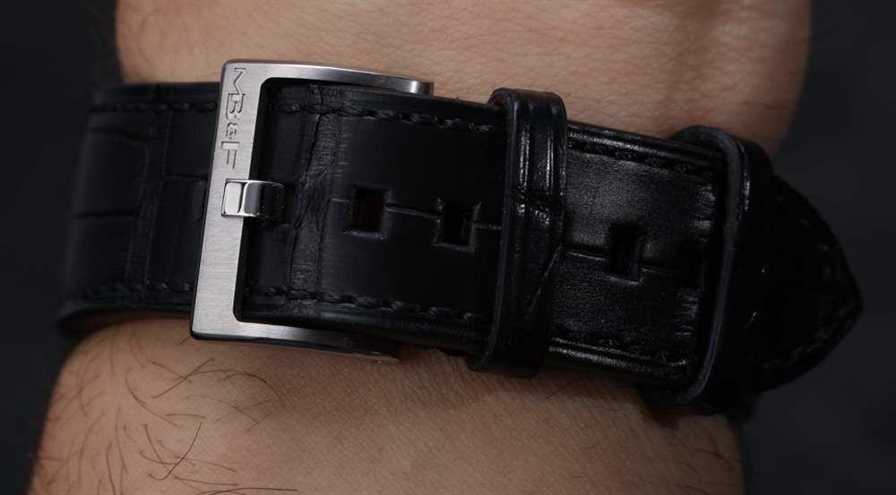 機芯由 241 個零件制成,工作頻率為 18,000 次/小時(2.5 赫茲),單個主發條可提供 45 小時的動力儲存。這種更適中的操作速度可以讓您更優雅地觀察兩個 11 毫米寬的擺輪在運行中。MB&F LM2 外殼本身寬 44 毫米,厚 19 毫米(比之前的 LM2 外殼薄 1 毫米),防水深度達 30 米。它配有一條制作精良的黑色鱷魚皮表帶。