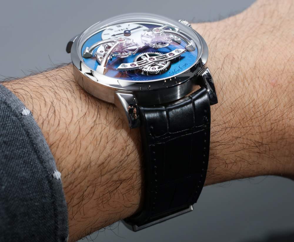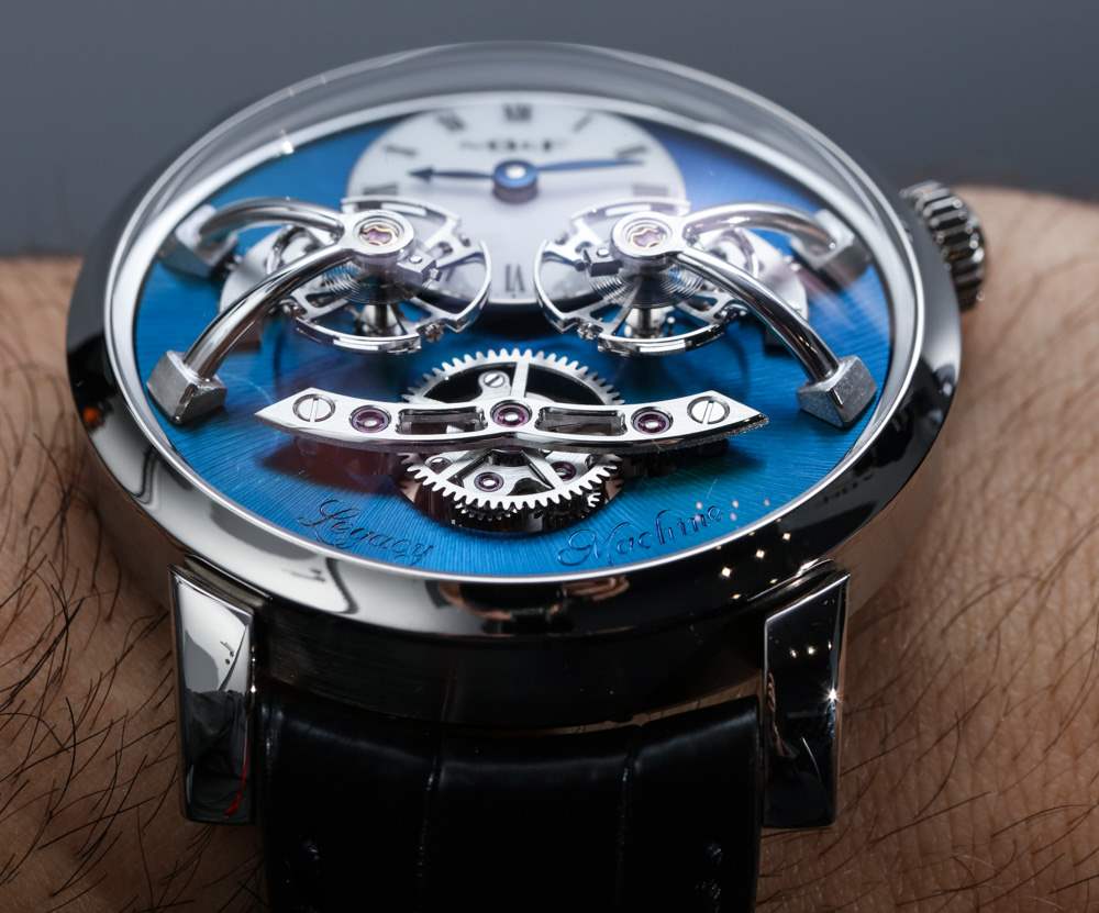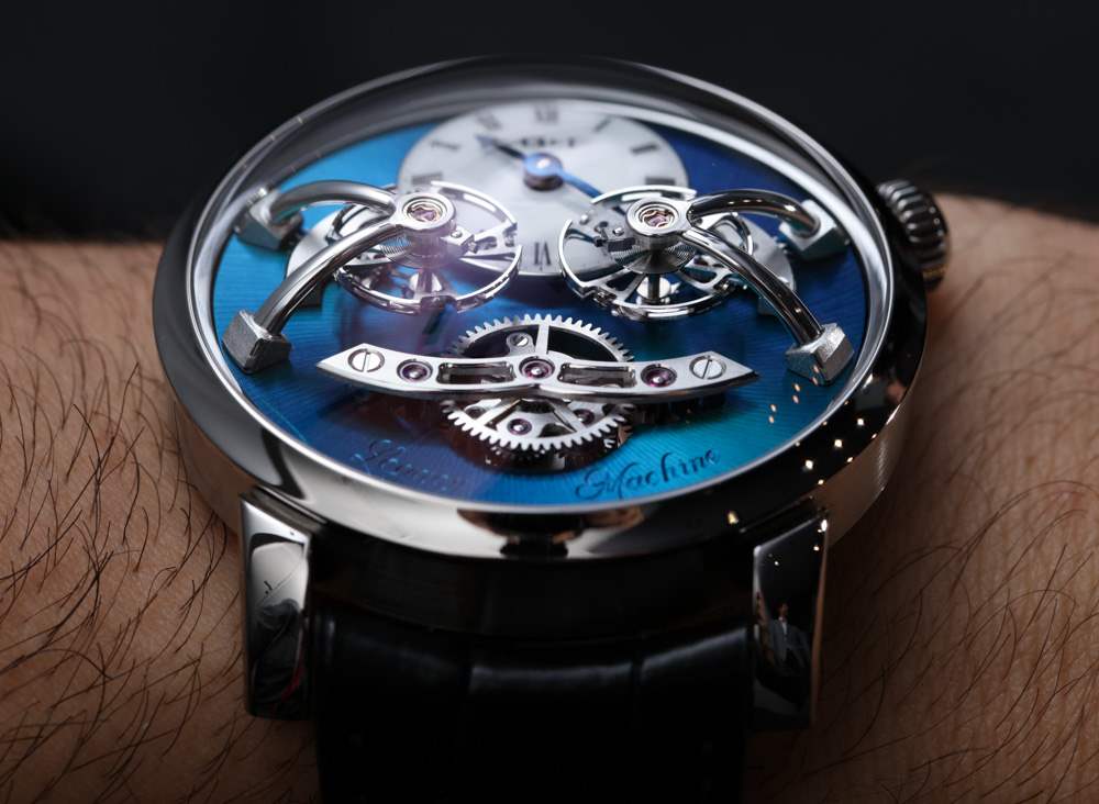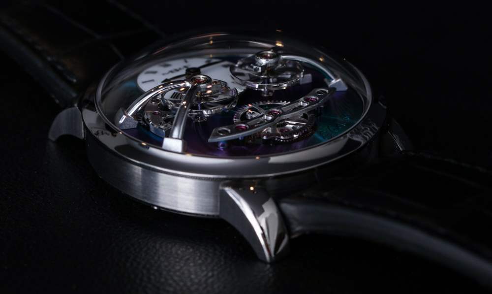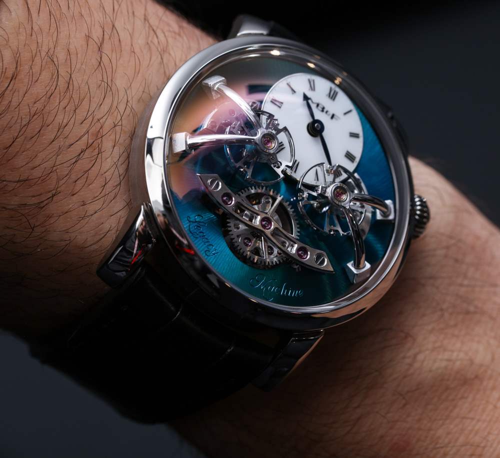 MB&F 顯然很享受讓他們的表盤供應商使用飾面和著色工藝(我認為這里是 PVD ??涂層工藝)。他們過去做過綠色,也做過藍色,現在他們提供了一種存在于中間某處的顏色,因為它與光一起玩。有趣的是,MB&F 甚至沒有嘗試自己給這種顏色起個名字。表盤的其余部分由偏心的白色時間子表盤和藍色 18k 金時針和分針,以及平衡輪的雙拱形橋板和行星差速系統的視圖組成。當您凝視著豐富的三維鐘表雕塑時,完成是一流的和華麗的。