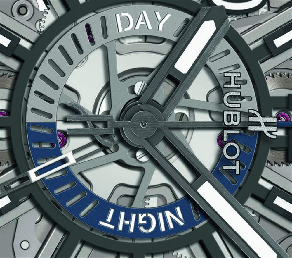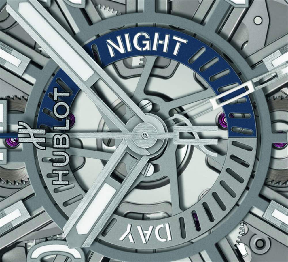 HUB1251 自動(dòng)機(jī)芯由 339 個(gè)零件制成,工作頻率為 4 赫茲(28,800 次/小時(shí)),動(dòng)力儲(chǔ)存三天(72 小時(shí))。除了有兩個(gè)時(shí)針指示本地和家鄉(xiāng)時(shí)間外,還有一個(gè)特殊的日/夜盤用于指示第二時(shí)區(qū)的上午或下午。對(duì)我來(lái)說(shuō),這是一個(gè)非常重要的功能,因?yàn)樵诓皇褂?24 小時(shí)時(shí)間格式的 GMT 手表中,很難知道“本地時(shí)區(qū)”是白天還是黑夜。有了這個(gè)圓盤,宇舶表Big Bang UNICO GMT的佩戴者便擁有了非常清晰的兩個(gè)時(shí)區(qū)時(shí)間的獲知能力,具有高度的便利性和易讀性。