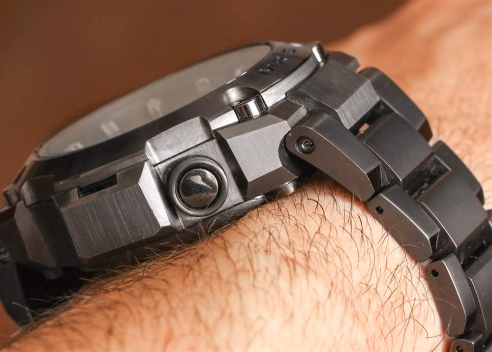 卡西歐再次能夠制造出佩戴舒適的超大手表。由于表殼、表耳和表鏈結構采用鈦金屬制成,我可以輕松地說,佩戴卡西歐 G-Shock MR-G MRGG1000B 時,您會忘記它就在手腕上。表殼寬 49.8 毫米,厚 16.9 毫米,從表耳到表耳的“高”為 54.7 毫米。然而它穿著非常明智。手鏈帶有全鏈節和半鏈節,三個微調銷棒固定在鎖定展開式表扣中,還具有一個很酷的滑動開關鎖。