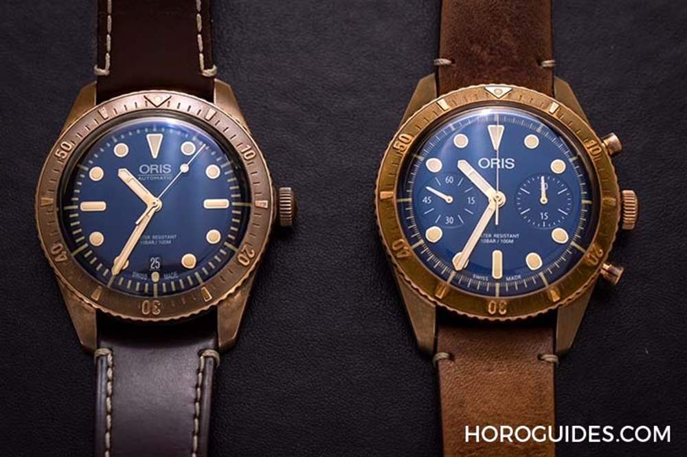 右為ORIS最新發(fā)表的青銅計(jì)時碼表,左為2016年推出的青銅腕表,同為Divers Sixty Five系列,限量2000只。最大的差別在于計(jì)時功能、日期窗與Automatic字樣有無、尺寸差1mm與表帶縫線。