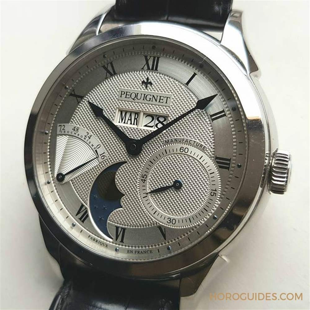 沒有太多人認識的法國品牌,機能性蠻強,面盤布局有特色,機刻雕紋,尤其直立式月相盤。機芯不是頂高級,但也屬于中上水準的專用機種,有JLC, Zenith的等級,拋磨修飾有到位。雙向自動上鏈,慣性螺絲微調擺輪(以4顆螺絲微調走時快慢) ,3日動力儲備。品牌經營有些問題,卻也是入手的好時機。