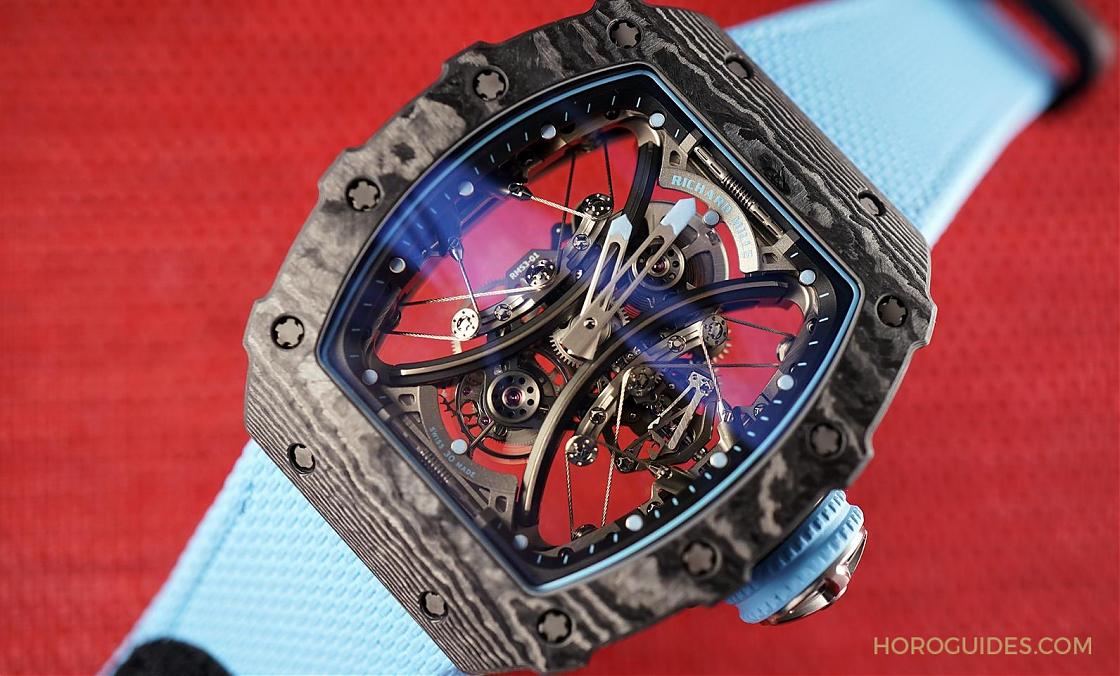 RICHARD MILLE在2012年就推出過馬球運動的表款RM 53 Pablo Mac Donough陀飛輪腕表,由于馬球運動選手不僅要控馬還要控球,其速度感與沖擊力都是相當大,因此在2012年版本的RM 53,就是將表盤上的時間顯示以及陀飛輪顯示窗縮到最小,藉由大面積的表殼來保護內部機芯,但是科技日新月異,在今年的RM 53-01 Tourbillon Pablo Mac Donough陀飛輪,可是完全鏤空透視給你看!能夠做到鏤空透視,又要能戴著運動,首先就是要表殼夠輕又夠堅硬,RM 53-01的表殼與先前的RM70-01以及RM 67-02相同,皆是采用RICHARD MILLE獨有的TPT?碳纖維。
