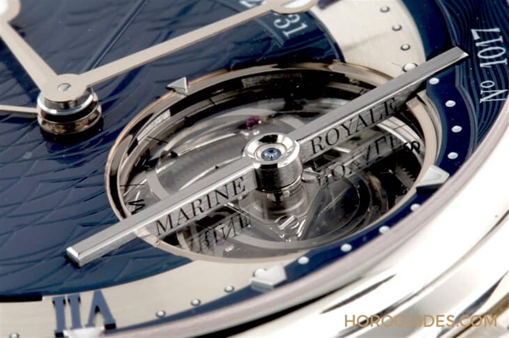 陀飛輪表橋側邊刻有”MARINE ROYALE”字樣,軸承為藍色的尖晶石。