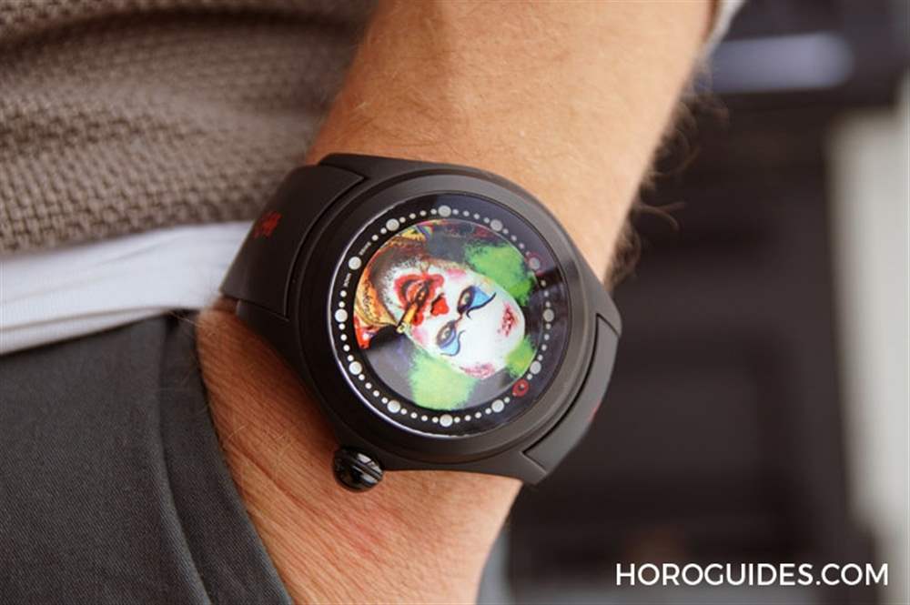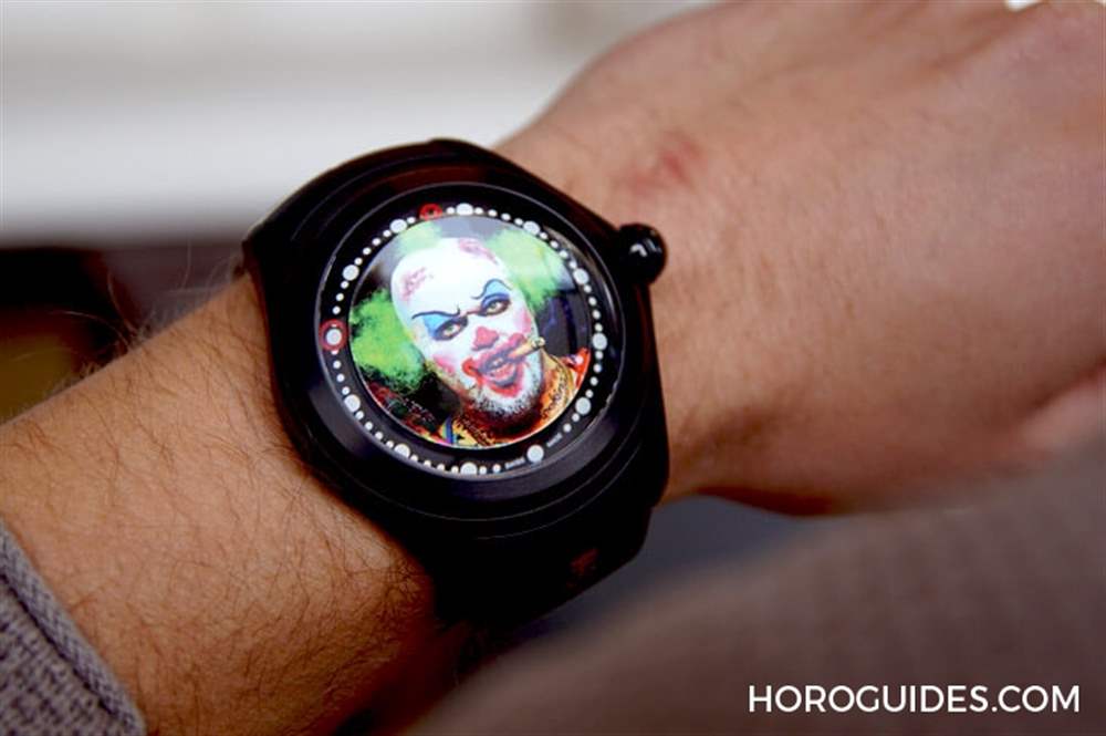為了不遮擋到表盤上的小丑畫作以及大曲面表靜戲劇性的放大效果,Bubble Clown小丑腕表沒有指針指示時間,而是以表盤外緣上的兩個紅圈來代表小時以及分鐘。