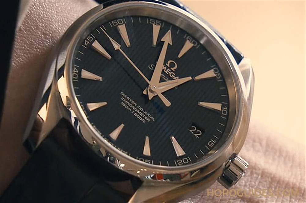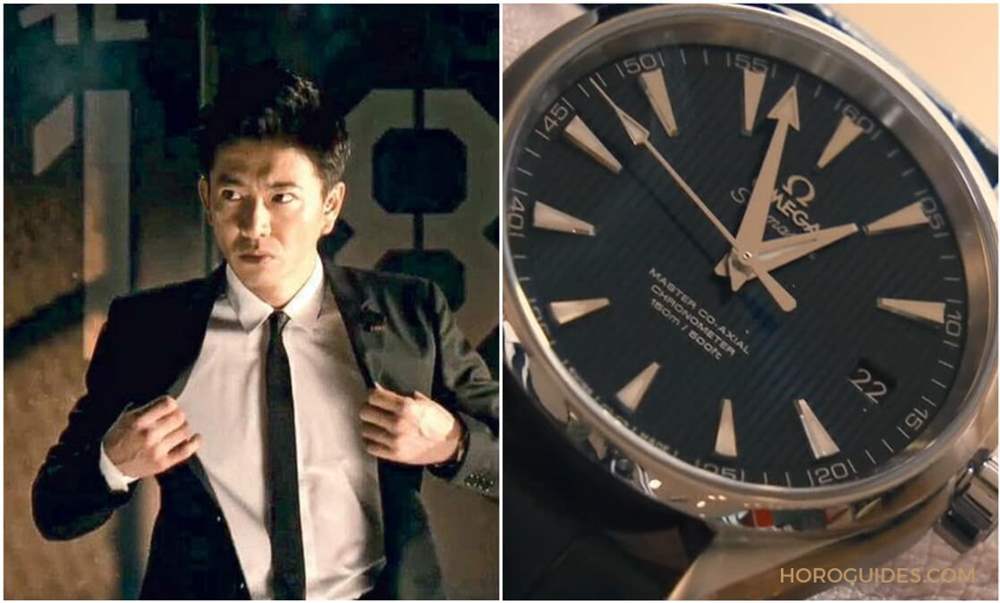 木村拓哉在片中飾演擁有神秘過去的貼身保鑣島崎章,手上佩戴的這只藍色表盤的歐米茄Aqua Terra Co-Axial Master Chronomaster,飾有獨特的水平線條「甲板紋」設計,靈感源自豪華游艇上的木質甲板。指針及時標均覆以白色Super-LumiNova超螢光涂層,防水150米。不過Aqua Terra 2017年新公布推出表盤直條紋改橫條紋的版本,日期窗也從3點鐘改到6點鐘。改版三大重點
