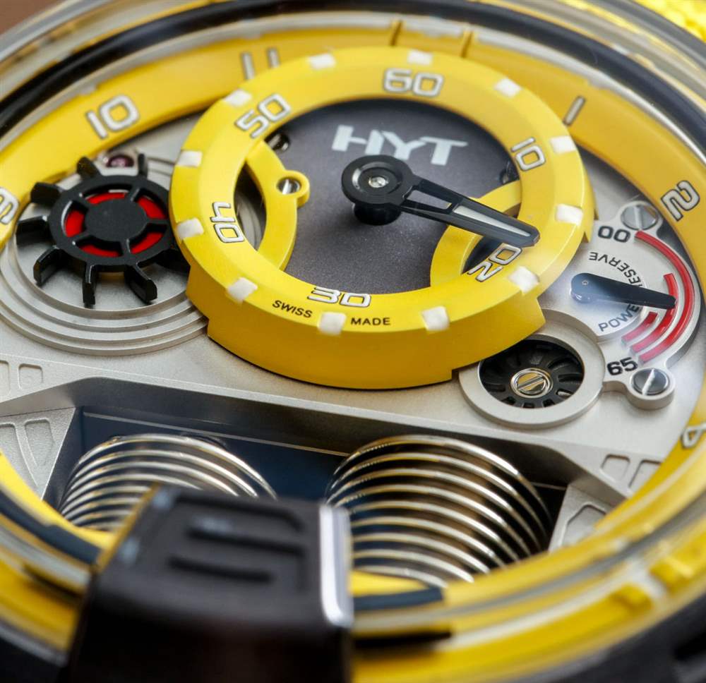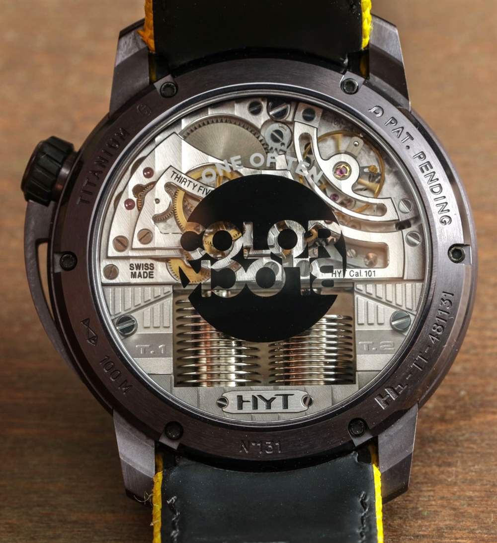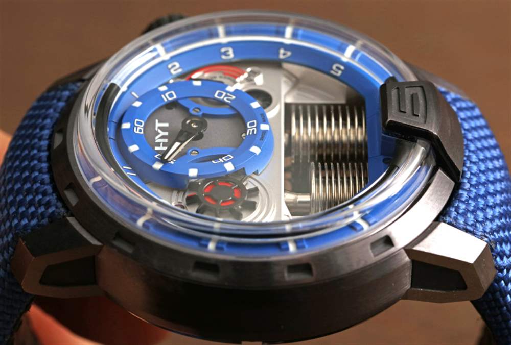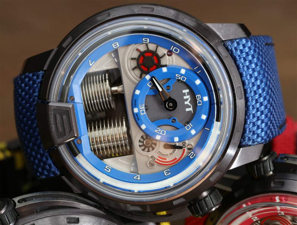 在藍寶石水晶上方的表殼背面是一個“拼色”標志圖形,坦率地說,我可以不用它。它并沒有真正增加任何藝術性,但我知道像 HYT 這樣的品牌希望幫助他們的限量版車型盡可能與眾不同。最低調的版本是HYT H1拼色藍色,它會受到不喜歡鮮紅色或黃色,以及喜歡穿很多藍色牛仔褲的男士的喜愛。