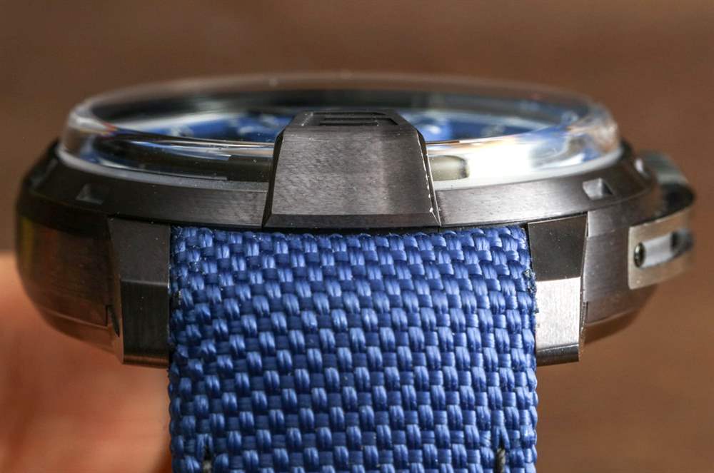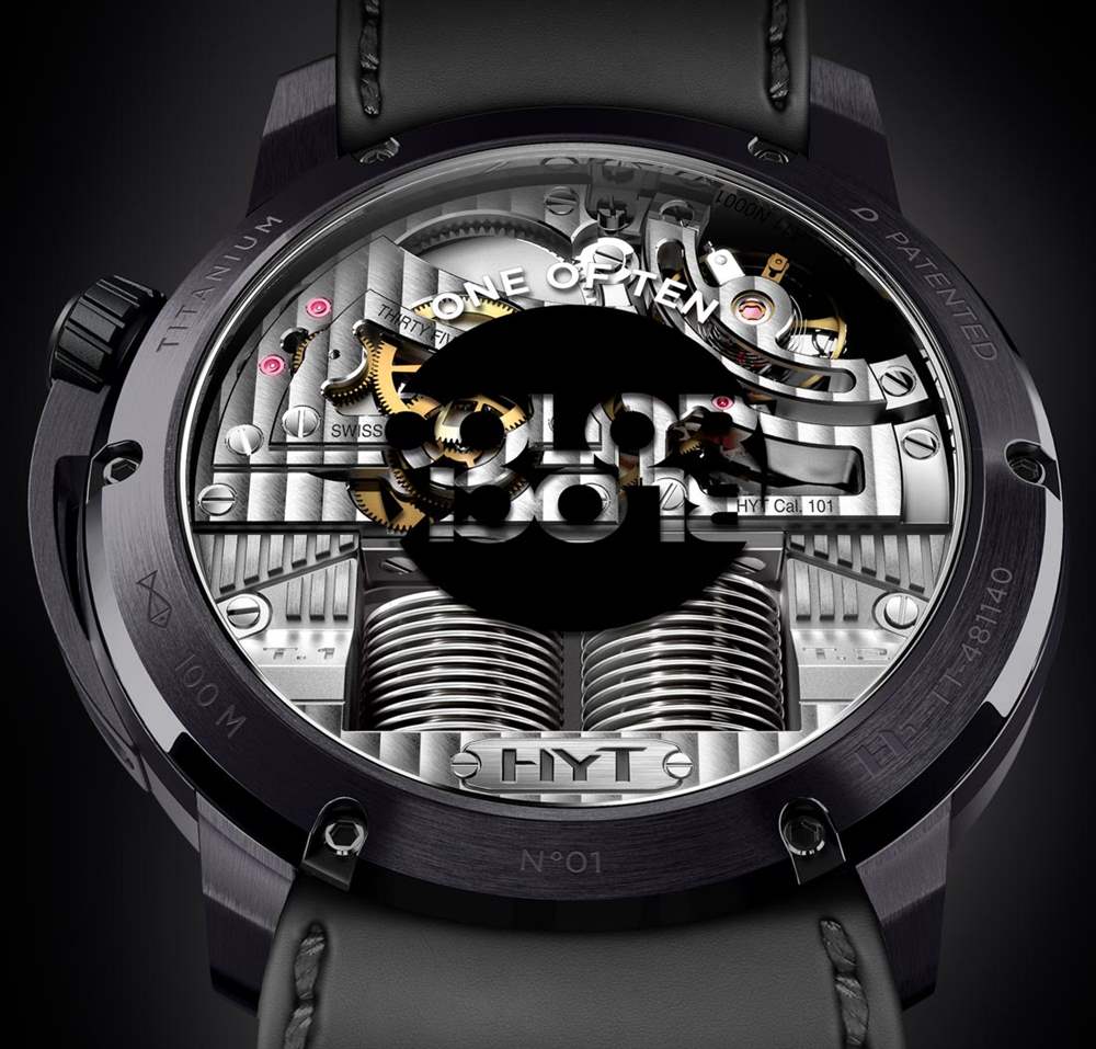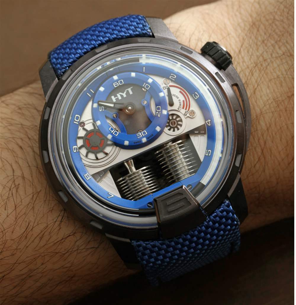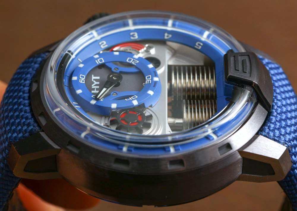 在藍寶石水晶上方的表殼背面是一個“拼色”標志圖形,坦率地說,我可以不用它。它并沒有真正增加任何藝術性,但我知道像 HYT 這樣的品牌希望幫助他們的限量版車型盡可能與眾不同。最低調的版本是HYT H1拼色藍色,它會受到不喜歡鮮紅色或黃色,以及喜歡穿很多藍色牛仔褲的男士的喜愛。