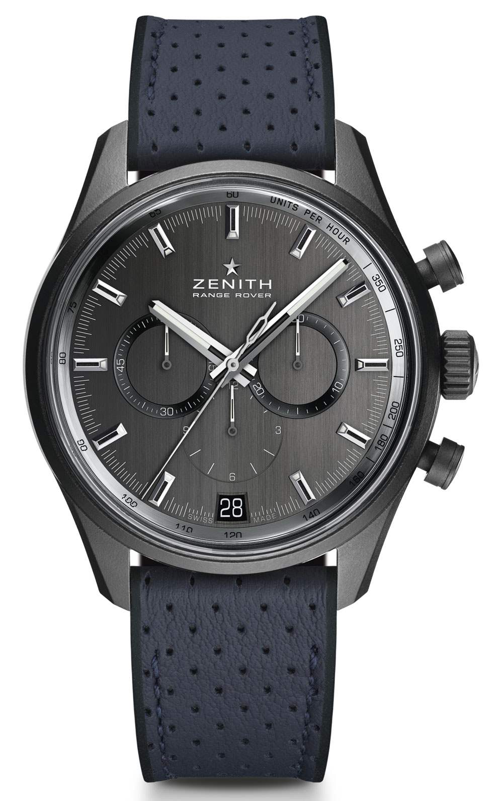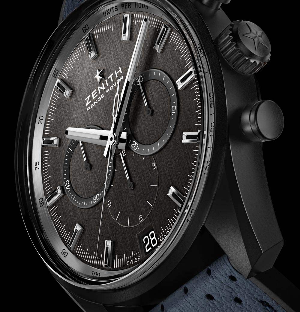 Zenith El Primero Range Rover 特別版腕表采用“陶瓷化”(我在想黑色陶瓷涂層——實(shí)際上就是這樣)磨砂鋁制表殼,寬 42 毫米,佩戴在手腕上應(yīng)該很輕。真力時(shí)評(píng)論說(shuō),鋁制表殼材料是對(duì)路虎攬勝底盤材料的一種認(rèn)可。鋁在高端表殼中很少見(jiàn),因?yàn)殡m然它很輕,但通常很脆弱。因此,我很想看看這款陶瓷鋁制表殼的親身感受如何——如果成功,它可以讓這款手表吸引那些甚至不關(guān)心路虎攬勝關(guān)系的人。