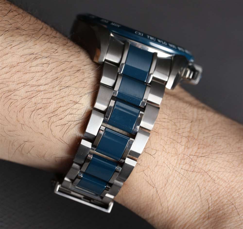 Seiko Astron GPS Solar Dual Time SSE043 戴在手腕上既迷人又現代,但又不失優雅。雖然它本質上是一款技術友好的小工具手表,但它確實具有一些性感魅力。精工喜歡在機場和類似地點為這些手表做廣告,但我認為他們需要盡可能多地關注像這樣的手表是對一個人風格的贊美。實際上,我從沒想過我會像這款手表一樣喜歡藍色和鈦金屬手表。精工生產了一系列采用鋼和鈦等材料的 Astron “8X”雙時區型號,但我覺得鈦才是真正的選擇。不僅因為它的重量更輕,還因為精工使用了比普通鈦更耐刮擦的處理鈦(精工稱之為“超硬涂層”)。此外,表鏈上的表圈和中心鏈節采用陶瓷制成,具有高度抗刮擦性。表盤上方是鍍增透膜的藍寶石水晶。從鋼款到鈦款,它的價格要高出大約 600 美元(零售價)——我強烈推薦它。