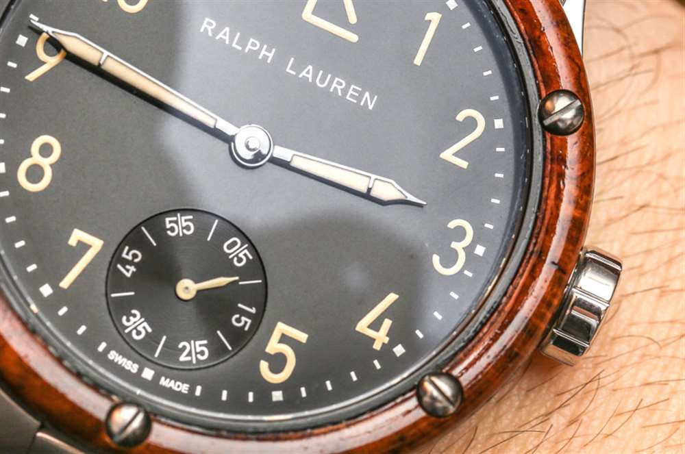 這些 Ralph Lauren RL Automotive 手表的木質表圈制作獨特,并用螺絲固定在表殼上。它們的顏色和紋理非常漂亮,很容易成為這些時計的亮點。非鏤空 RLR0220710 的表盤上是一組簡單的指針和時標,采用復古風格的顏色(即發光體),只有時間和小秒盤。然而,我仍然不是這個特別的 Ralph Lauren 標志的超級粉絲,我更喜歡這個品牌最初在他們的鐘表上出現的標志。