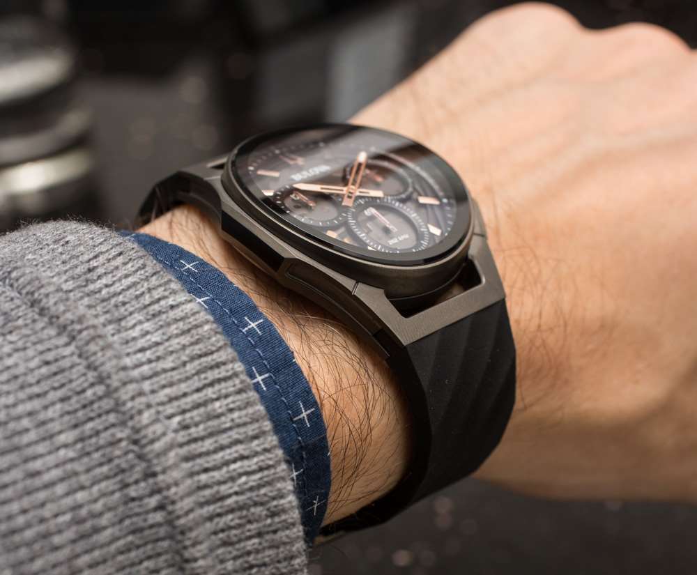 那些想要“充分”體驗 Bulova CURV 手表體驗的人可能會喜歡這兩款更具“技術外觀”的型號,分別是鋼和鈦的參考型號 98A161(799 美元)和 98A162(899 美元),以及最現代的型號-外觀 Bulova CURV 系列。這些型號采用更長的表耳,采用 44 毫米寬(9.7 毫米厚)的表殼和附帶的黑色 EPDM 橡膠表帶。這些是唯一帶有展覽底蓋的型號,它們也有半鏤空表盤。這些實際上是“中型”Bulova CURV 選項,因為 Bulova 也有 43 毫米寬的型號和 45 米寬的 CURV 型號——盡管其他型號的佩戴方式大不相同,因為它們具有不同的表殼和更傳統的表耳結構。
