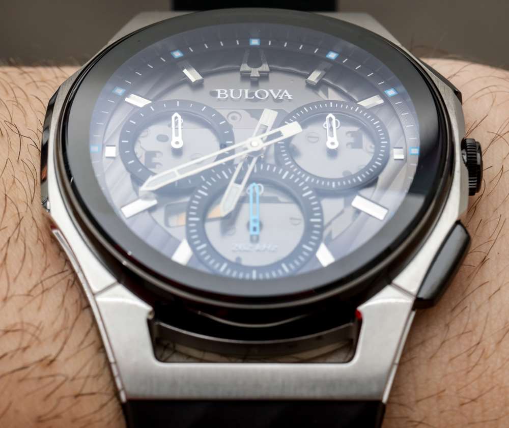 Bulova CURV 的較小版本并不是真的很小,但它具有不同的表殼設計。正如我所說,在發布時,Bulova 提供三種不同的表殼設計,每種都使用 CURV 機芯。首次亮相系列的最后一部分有一個 43 毫米寬的表殼(9.4 毫米厚)。順便說一下,所有 Bulova CURV 表殼都防水 30 米。這些最后的模型可能會成為最具吸引力的模型,因為它們在設計上接近于非常現代,但嘗試混合設計元素以通過“技術設計扭曲”來制作從休閑到正式的吸引力。在某些方面,這些看起來像是一些早期 Bulova Precisionist 手表的更精致版本。