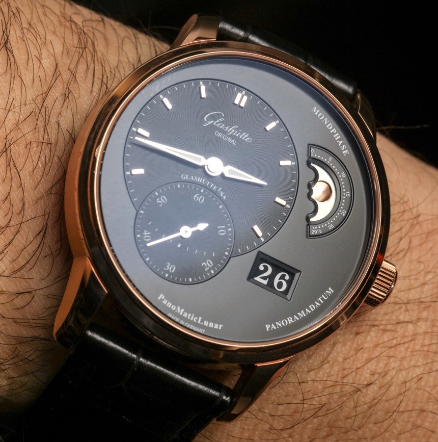 在手腕上,Glashütte Original PanoMaticLunar 的尺寸更為傳統,寬度為 40 毫米——此處采用 18k 紅金打造,看起來十分光滑。就像我說的,這款手表也有鋼制的。Glashütte Original PanoMaticLunar 的厚度為 12.7 毫米,考慮到機芯的尺寸,這是可以理解的,但它比正裝表更厚。話雖如此,對于那些覺得 40 毫米寬的尺寸不夠大的人來說,近 13 毫米的厚度確實有助于讓手表感覺更大。我也很欣賞,雖然它不是運動手表,但 50 米的防水性能優于您在許多其他類似手表中看到的 30 米防水性能。