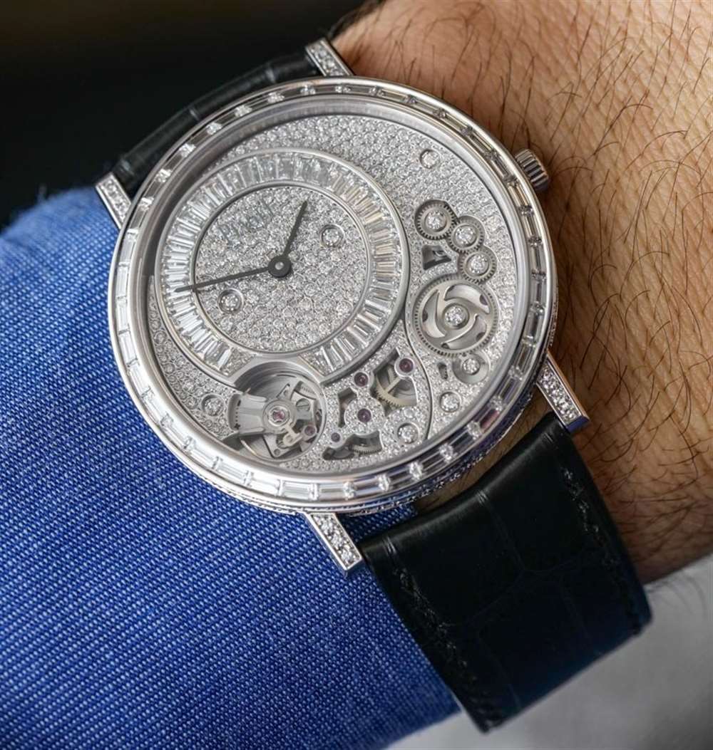 2013 年,伯爵發(fā)布了 3.65 毫米厚的Altiplano 900P,成為世界上最薄的手動上鏈腕表。它是如此之薄,以至于機(jī)芯的背板也是底蓋。我真的不認(rèn)為任何人都能在短期內(nèi)明顯減少這個微小的尺寸。那么伯爵在2016年做了什么?珠寶腕表愛好者,讓 Piaget Altiplano 900D 大飽眼福——最薄的手動上鏈機(jī)械腕表,表殼和表盤均鑲嵌鉆石。Altiplano 900P 由 304 顆鉆石轉(zhuǎn)變?yōu)榱钊擞∠笊羁痰?Altiplano 900D,超薄“高級珠寶”從未如此好看。