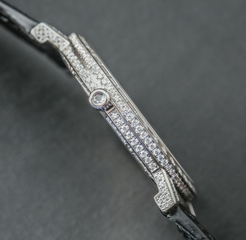 Altiplano 900D 的寬度為 38 毫米,非常適合作為正裝手表佩戴。黑色指針非常清晰易讀,特別是因為時間表盤以長方形切割鉆石環(huán)突出顯示。我會喜歡小時刻度的分界線,但對于這樣的手表,為什么要抱怨這樣的事情呢?900D 表殼和表盤共鑲嵌 5.77 克拉鉆石。