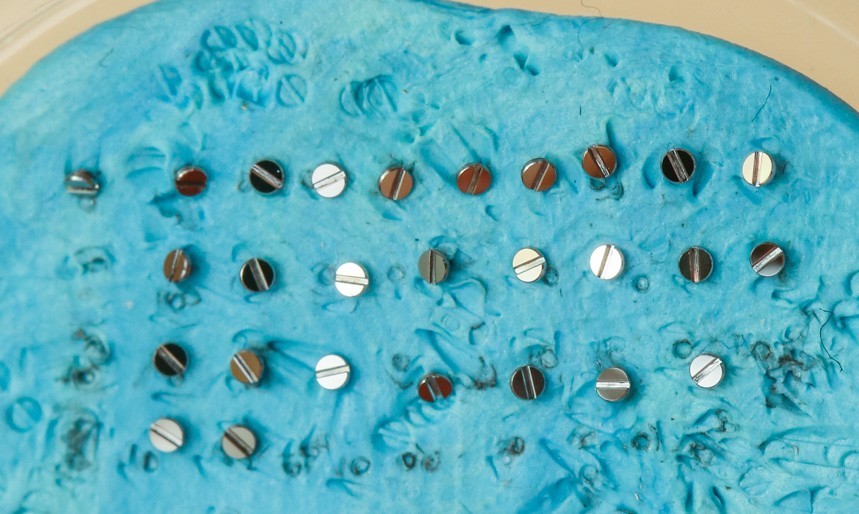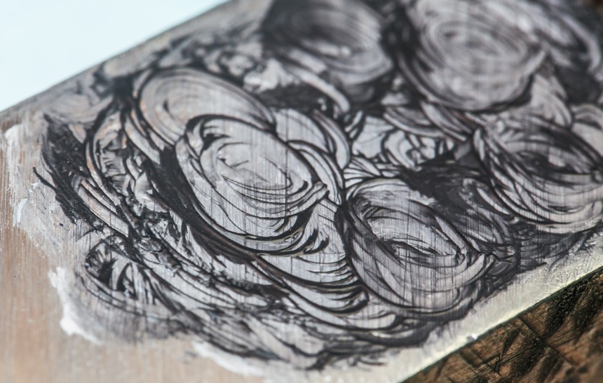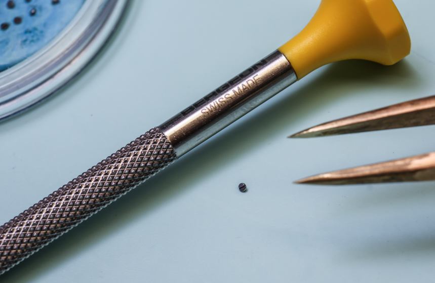 我正在看著一位年輕的制表師在一塊錫板上拉東西。是的,舊的“罐頭金屬”顯然是理想的底座,上面涂上一層薄薄的金剛石膏以“黑色拋光”螺絲的尖端。當(dāng)我盯著一個(gè)小盤(pán)子時(shí),一顆螺絲被小心翼翼地滑過(guò)錫棒的表面并拉動(dòng),藍(lán)色的粘性材料上鑲嵌著閃亮的金屬片,幾乎在任何制表師的辦公桌上都能找到這種材料。在膩?zhàn)拥乃{(lán)色“無(wú)劃痕區(qū)”中,是一系列經(jīng)過(guò)精心加工的成品螺絲。