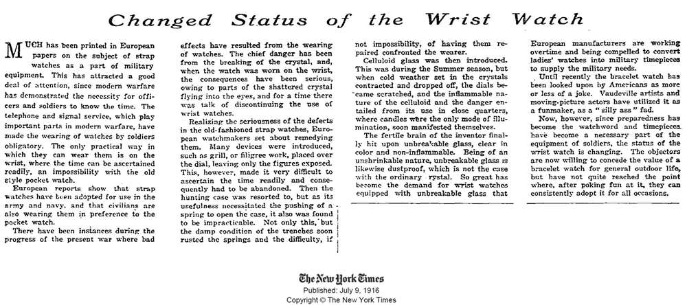 盡管 1916 年紐約時報的文章相對簡潔,但其中包含大量與時代相關的信息。人們為尋找合適的手表而進行的斗爭讓佩戴者和制表師想出了有趣的解決方案。請注意,在文章的一部分中,建議士兵開始在手腕上佩戴女式手表,因為與正在改裝的較大懷表相比,女式手表更適合表帶。顯然,鑒于對鐘表的需求,是手表制造商在戰爭期間轉向為男士改裝女士腕表。