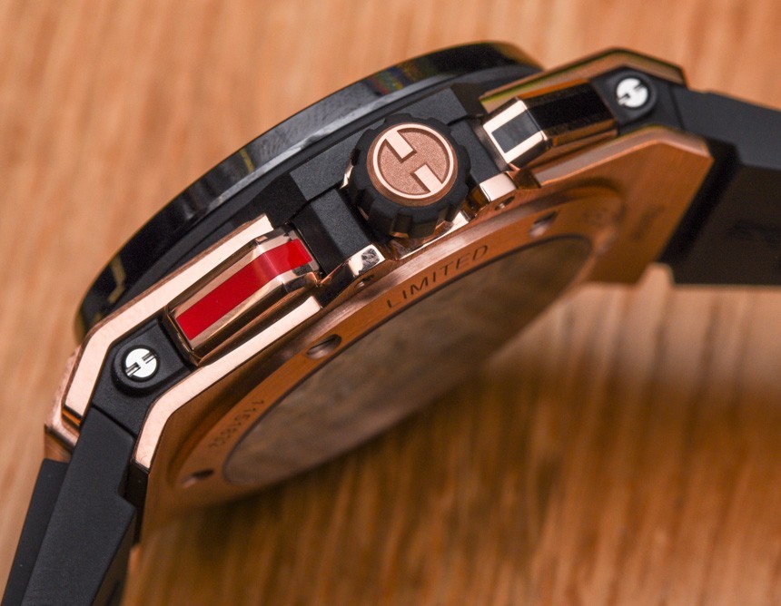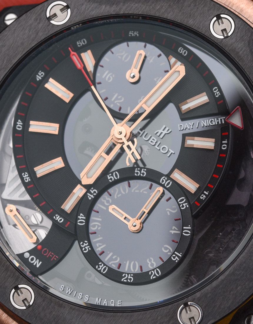 HUB5003機(jī)芯采用硅質(zhì)擒縱系統(tǒng),動(dòng)力儲(chǔ)存72小時(shí),包括帶24小時(shí)指示的時(shí)間、用于設(shè)置未來24小時(shí)鬧鐘時(shí)間的24小時(shí)表盤,以及一個(gè)警報(bào)并發(fā)癥的開/關(guān)開關(guān)。此外,表盤由半透明材料(幾層彩色藍(lán)寶石水晶)制成,即使 Hublot Big Bang Alarm Repeater 沒有所謂的鏤空表盤,也可以瞥見下面的機(jī)芯。