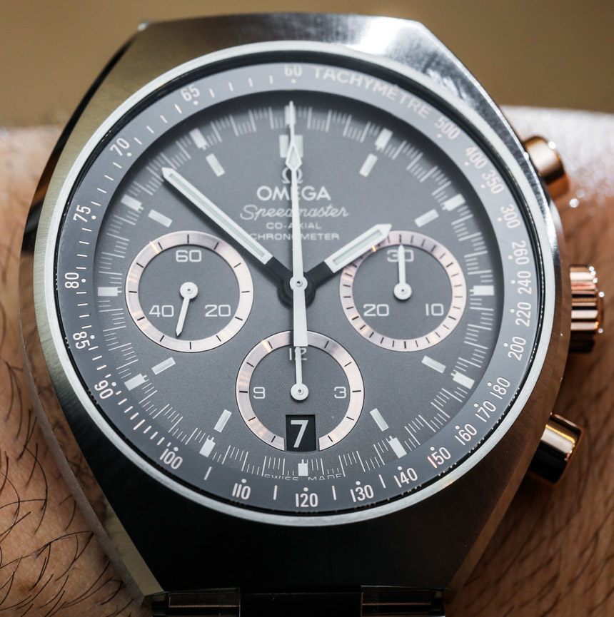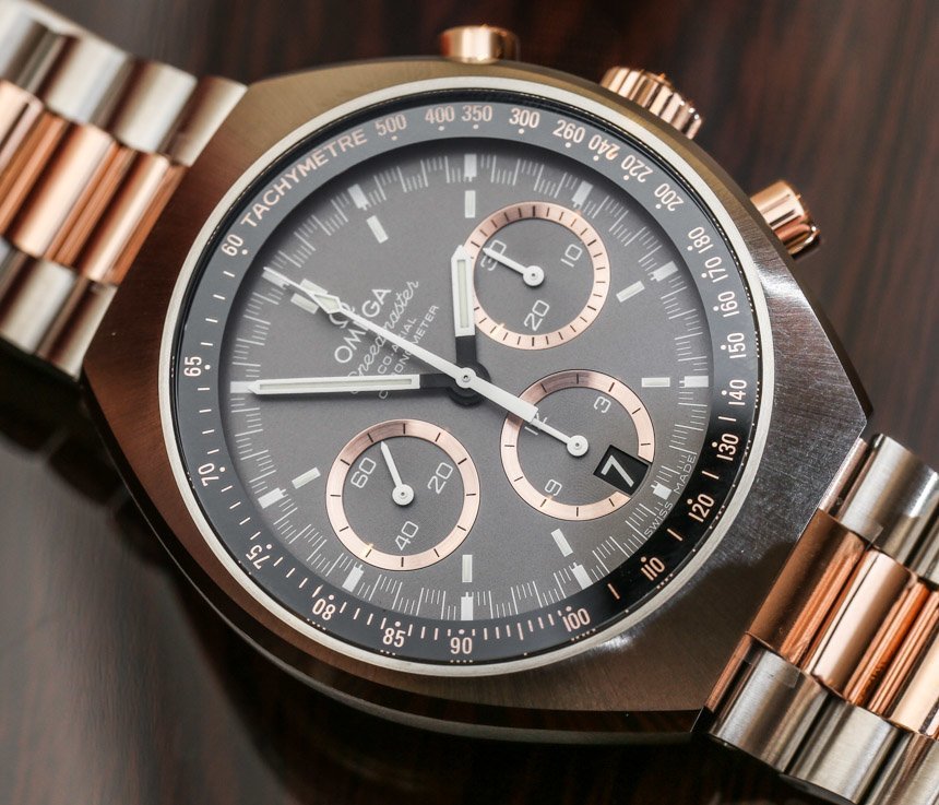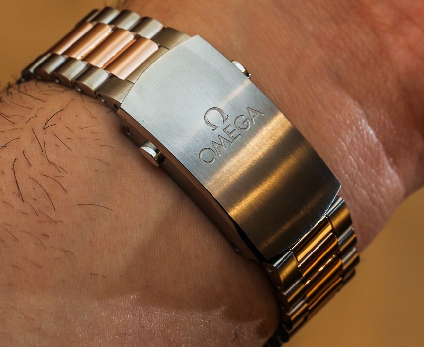 全鋼歐米茄超霸 Mark II 的一些樸素工具表外觀在這款雙色調(diào)模型中有所改變,因?yàn)榻鹕亟?jīng)過拋光而不是拉絲處理。這主要適用于手鏈上的中心鏈節(jié)。黃金還用于表冠和計(jì)時(shí)按鈕。我們談?wù)摰氖菤W米茄的 18k Sedna 金——這是他們的勞力士 Everose 金版本。這些是 18k 玫瑰金合金,其顏色不會(huì)隨著材料磨損而褪色。