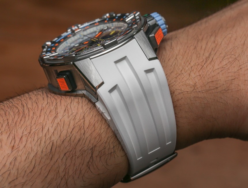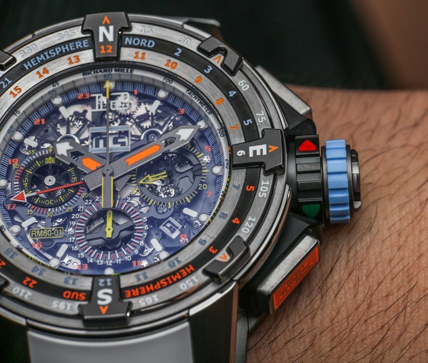 雖然 Richard Mille RM 60-01 Automatic Flyback Chronograph Regatta Les Voiles de St. Barth 限量版的顏色俏皮,外觀上幾乎像玩具,但只要看一眼手表就足以讓您意識到這是一個嚴肅的手腕機器。Richard Mille RM60-01 表殼非常大,寬 50 毫米,厚度與之相匹配。話雖如此,精心加工的鈦金屬表殼戴在手腕上卻無比舒適。我發現許多 Richard Mille 時計都是如此——人體工程學是價值主張的一部分,你永遠不會戴這么大的手表,以至于你會忘記它的存在。