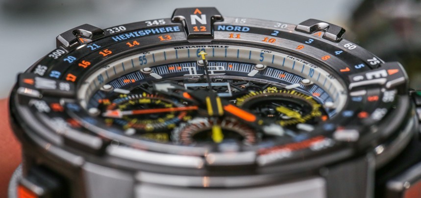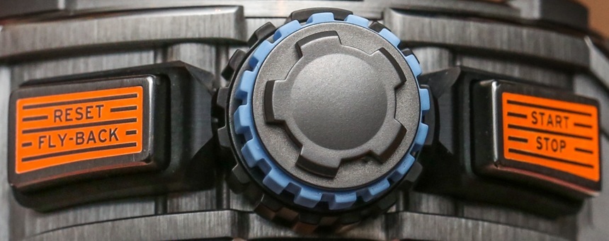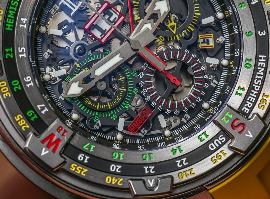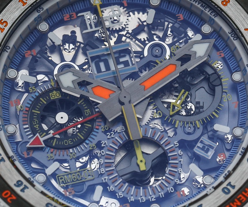 說到旋轉表圈——操作 Richard Mille RM 60-01 自動飛返計時碼表 Regatta 的表圈是一種樂趣,因為它轉動并發出咔嗒聲,并帶有美妙的觸覺反饋和聲音。仔細觀察表圈以及表殼和表盤的其他部分,可以發現標記以鮮艷的顏色印刷得多么漂亮。