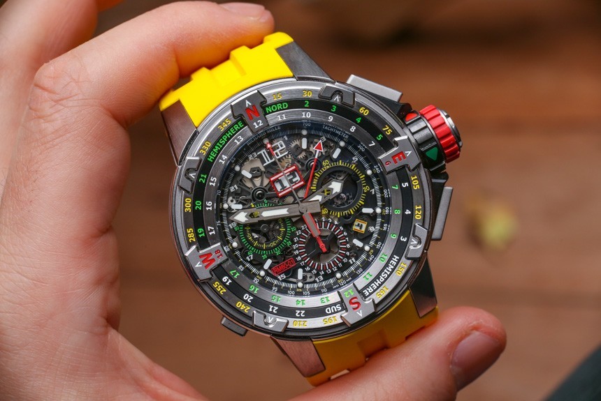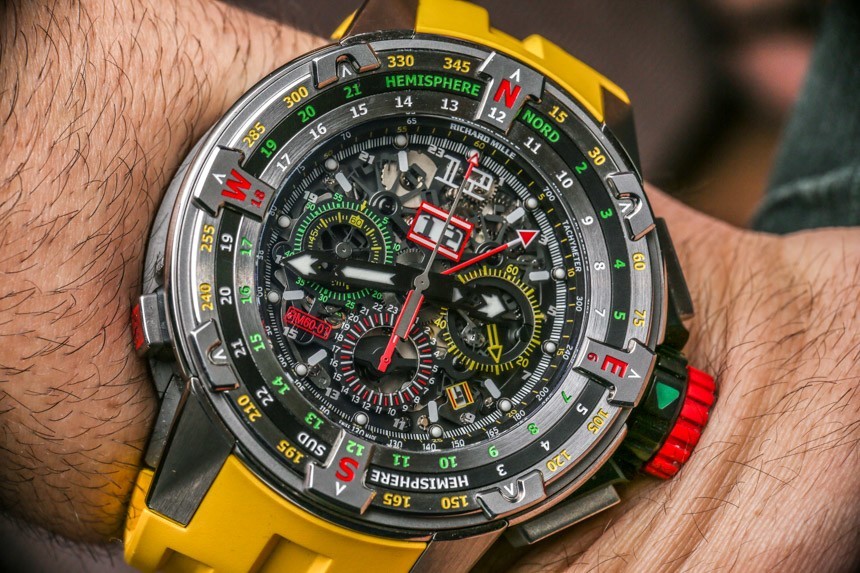 回到表盤,您當然可以看到機芯的骨架視圖,但由于適當的紋理和清晰的細節應用(以及在這種情況下,明亮的顏色),確保了易讀性。這不是第一款 Richard Mille 手表用顏色來嘲笑玩 Fisher Price 玩具的幼兒,但在我看來,“極端”的調色板只會增加像這樣的限量版模型的小眾吸引力。