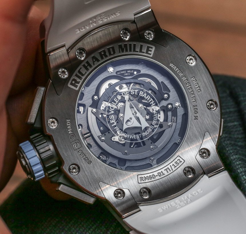 透過 Richard Mille RM 60-01 Automatic Flyback Chronograph Regatta 表殼的背面,可以看到具有現代外觀的自動機械機芯,其黑色板材和 Richard Mille 聞名的獨特“花鍵螺絲”。藍寶石水晶窗上方是 Les Voiles de St. Barth 標志,指的是限量版時計與活動的聯系。