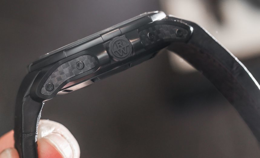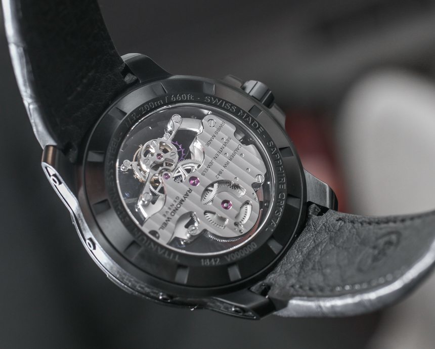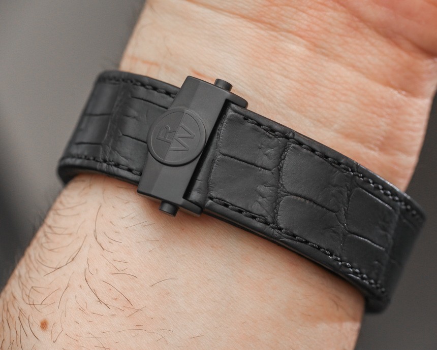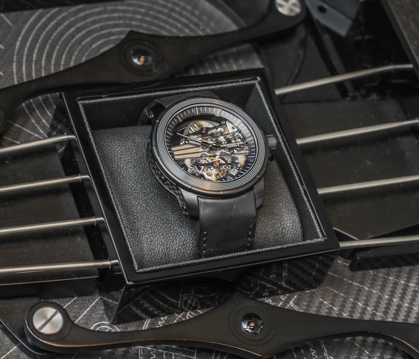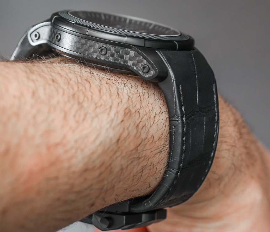黑色調的 Nabucco 風格表殼同樣為 46 毫米寬,由鋼、鈦和碳纖維制成。它的厚度為 15.25 毫米,算不上薄——這就是為什么我一直說“運動手表”,盡管考慮到機芯,這款手表具有明顯的精致特性。從美學的角度來看,一系列啞光黑色表面增強了運動感,包括表殼、部分鏤空表盤以及啞光黑色鱷魚皮表帶。雷蒙威 Nabucco Cello Tourbillon 是運動手表的一個加分項是表殼防水深度達 200 米。