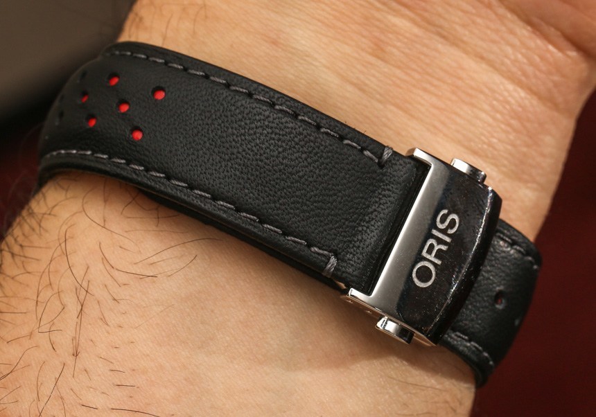 單看手表,我仍然對(duì)薄型旋轉(zhuǎn)計(jì)時(shí)表圈和更大感覺的表盤印象深刻。按鈕和表冠做工精細(xì),整體外觀和手感對(duì)于 Oris 來說都是一流的。與表殼相連的是帶有鈦金屬展開式表扣的穿孔賽車風(fēng)格皮革表帶。
